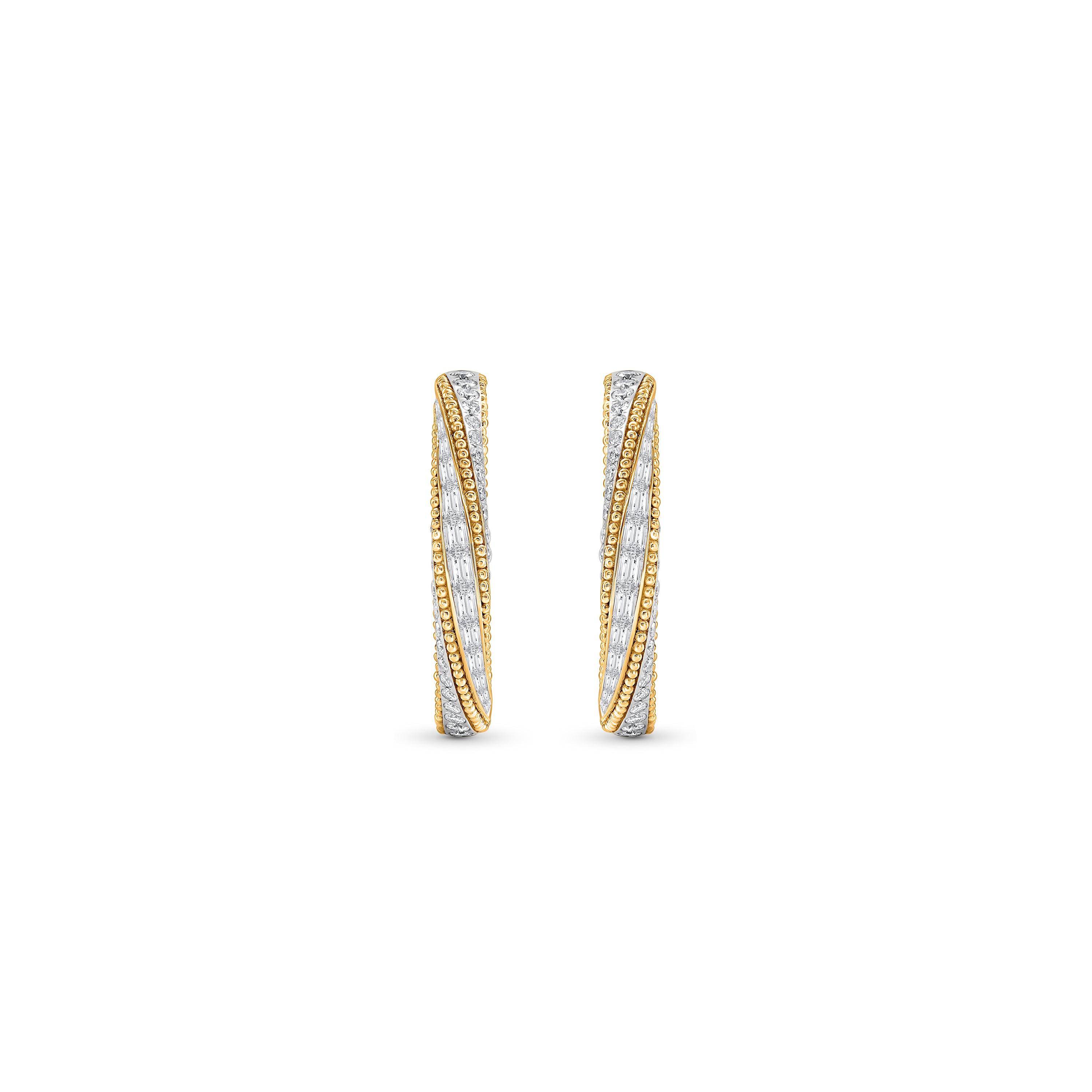 Inspired by the journey of the sun’s rays traveling through space and time to brighten our world, these hoop earrings are set with brilliant-cut baguette diamonds in 18kt gold. An artisanal form of embroidery known as pota is recreated especially for gold using delicate handmade granulations.
